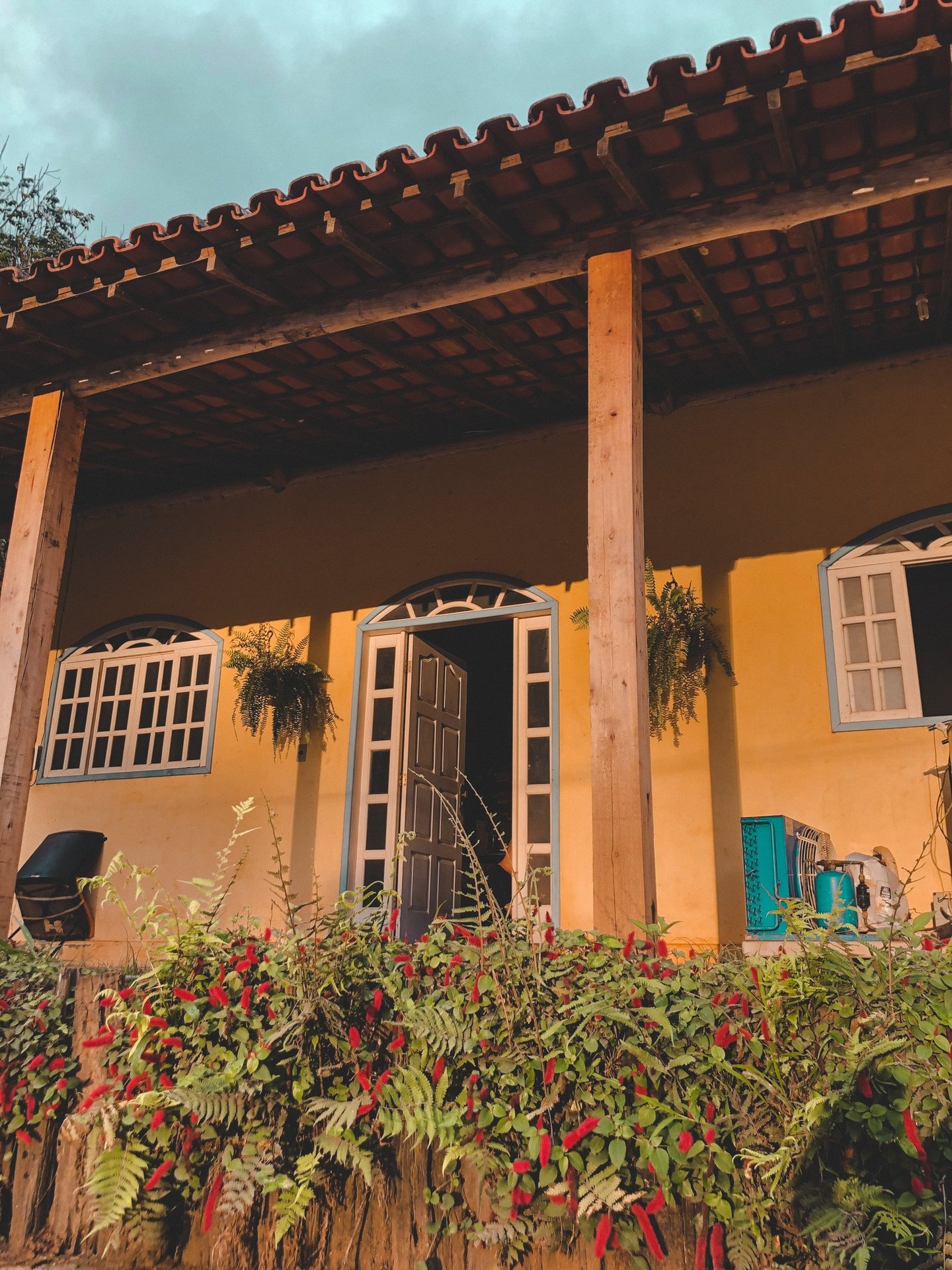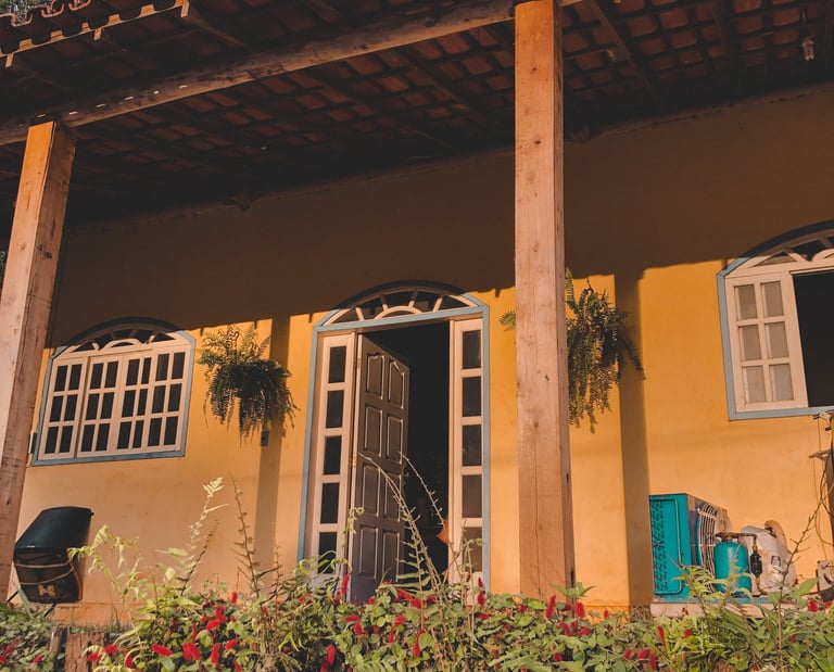 Uma casa ampla, com três quartos, localizada em uma fazenda de café.
